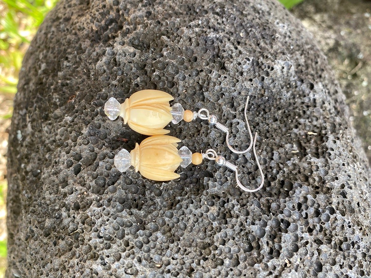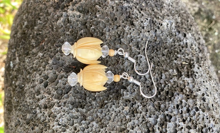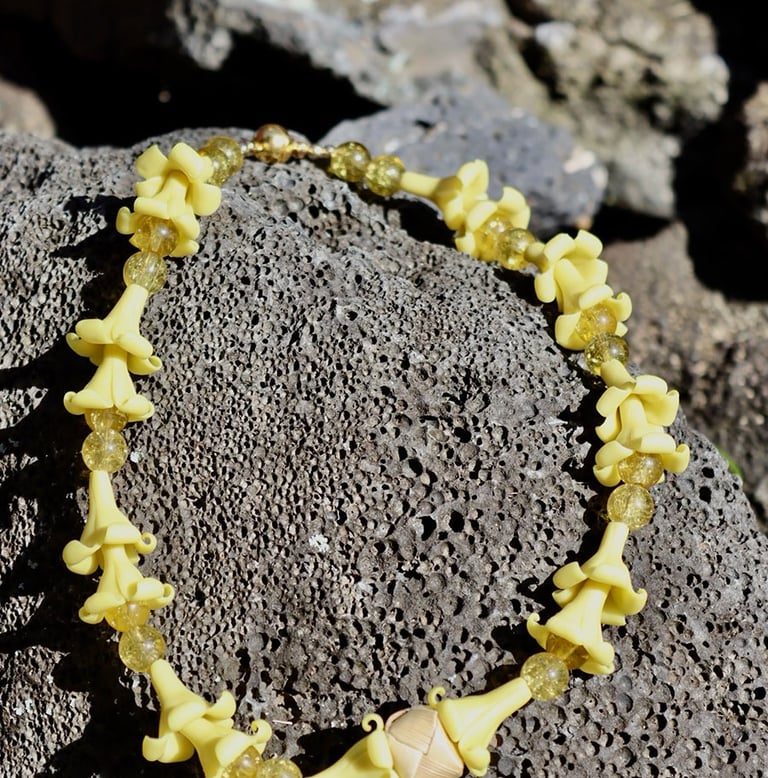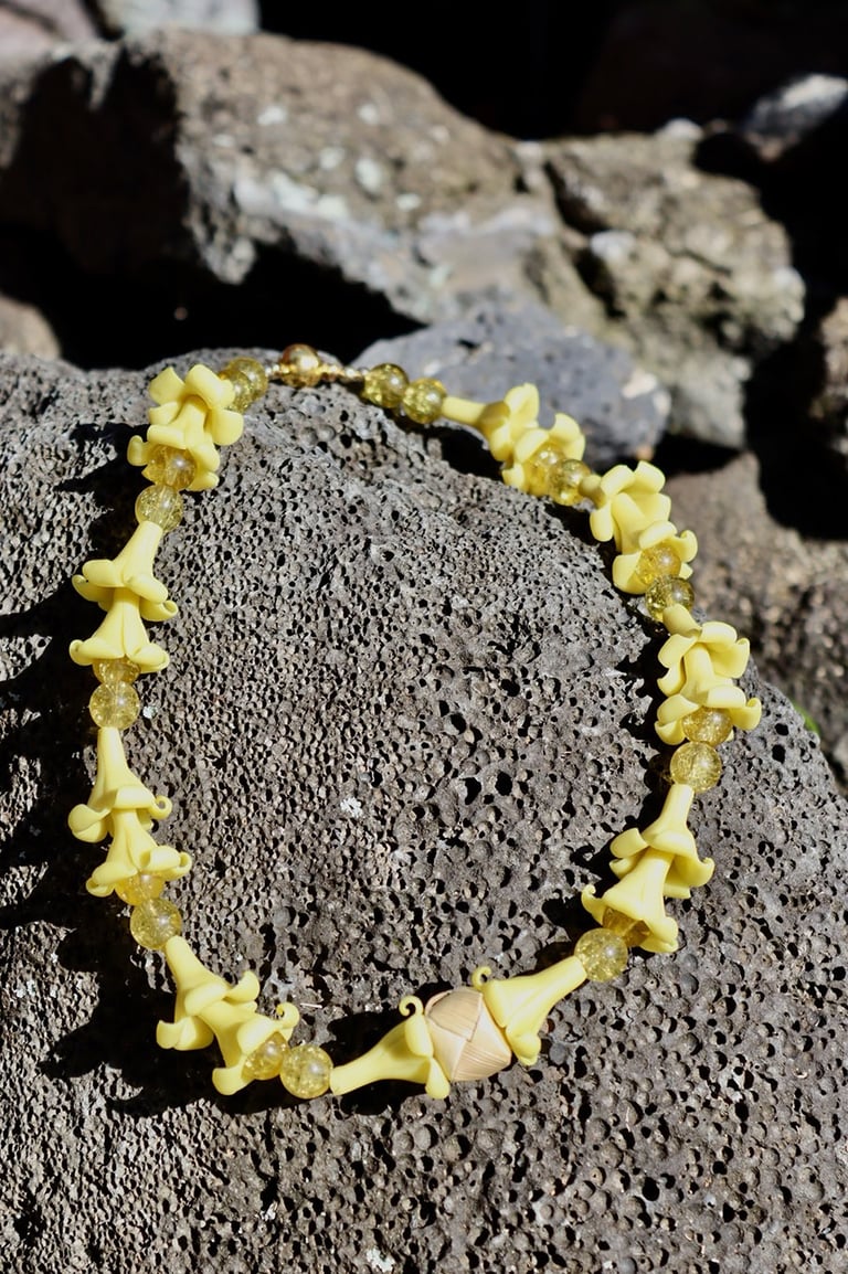 Hawai’i Island and its beautiful people are her inspiration. “I get as much pleasure making Ti Leaf lei as I do creating a piece with precious stones.